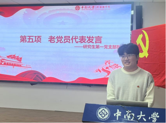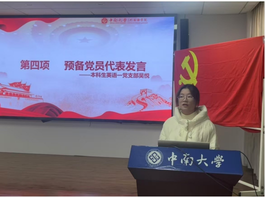 大会第五项,研究生第一党支部的张佳暄同志作为正式党员代表发言。他首先对大家加入党组织表示了热烈欢迎,接着指出党员身份不仅是象征,更意味着肩上担负的沉甸甸的责任与使命。他还结合自身所学专业实际,呼吁大家要将个人成长融入国家发展需求,致力于用多语言、多平台传播中国声音,在服务社会中练就过硬本领,勇于担当作为。