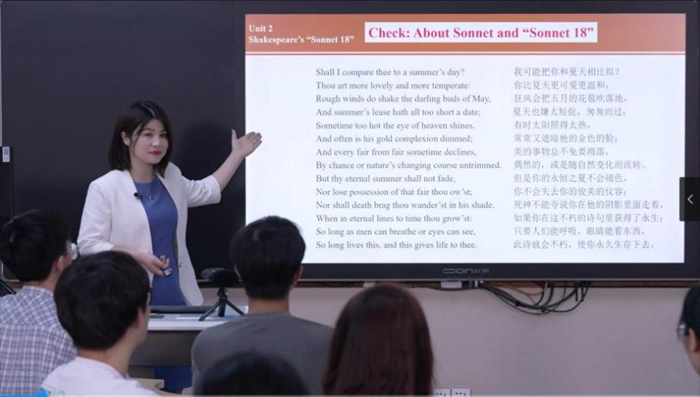 易鸣老师的参赛课程基于吴玲英教授主持的教育部精品视频公开课《英诗赏析》,选取莎士比亚的十四行诗Sonnet 18作为教学内容开展设计。该设计在对Sonnet 18主题的挖掘上并未将莎士比亚的十四行诗局限于传统的有关爱情、友情、诗歌永恒性的探讨,而是凸显创新贡献所带来的永恒性,帮助学生树立通过创新造就永恒的理念,增强他们的创新意识,培养创造精神。