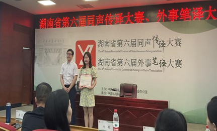 528日举办的湖南省第六届同声传译暨外事笔译大赛中,我院西班牙语专业学生任真获笔译特等奖(第一名),杨叶怡获二等奖(第六名),孙纯获三等奖(指导老师方丽君)。