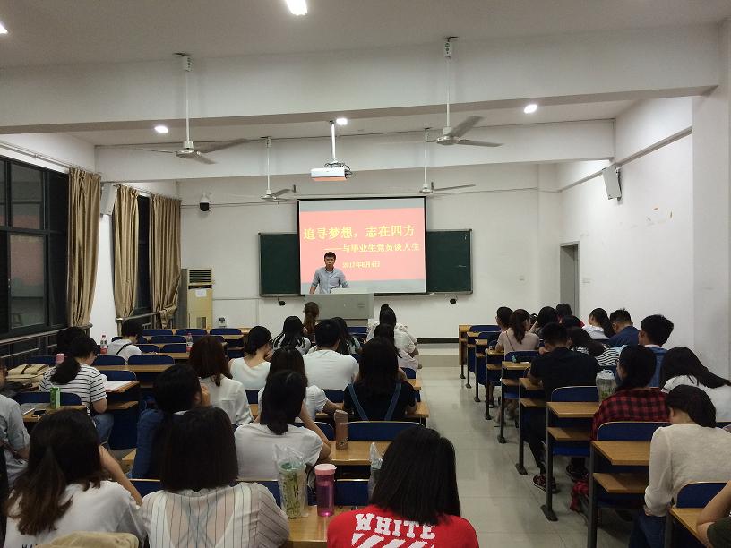 本次教育活动第一项为“与毕业生党员谈人生”,钟佳老师作为支部书记给大家分享了自己丰富的工作经验和工作时所信守的理念。他着重强调了作为党员同志的责任与担当,要肩负起对自己、对家人、对社会和对国家的责任,以实现中国梦为自己奋斗的目标,身为中南毕业学子,有责任和义务为中华民族的伟大复兴而努力奋斗!钟佳老师的分享深受各位党员同志认同,没有任何一个“低头族”的存在。最后,钟佳老师引用了一段话送给了党员同志“我唯一害怕的,是你们已经不相信了——不相信规则能战胜潜规则,不相信学场有别于官场,不相信学术不等于权术,不相信风骨远胜于媚骨。你们或许不相信了,因为追求级别的越来越多,追求真理的越来越少;讲待遇的越来越多,讲理想的越来越少;大官越来越多,大师越来越少。因此,在你们走向社会之际,我想说的只是,请看护好你们曾经的激情和理想。在这个怀疑的时代,我们依然需要信仰。”,希望大家要坚持自己的理想,不忘初心。