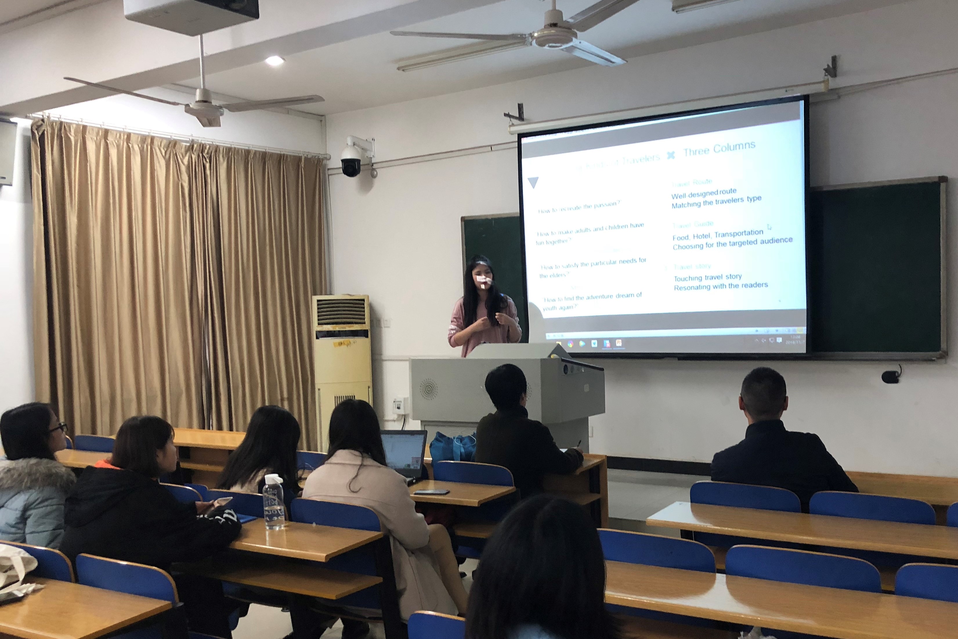 2016级英语系5个班共20个代表队,运用课程中所学到的新媒体知识,分析社会热点,深度挖掘社会问题,全英文进行课题研究,创建并运营了属于自己的微信公众号。在大赛中,同学们上台展示实践成果,制作静心,独树一帜,研究深入,剖析问题颇有见地。有的讲述了自己对英语专业学生发展前景的探寻,有的用独特新颖的眼光看中西文化的交汇融合,有的带领我们赴往一场美食的邀约。同学们展示毕,评委老师们对大家的研究成果表示了鼓励与肯定,并提出恳切的建议。