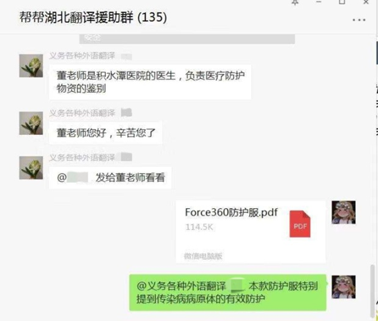 疫情发生以来,海外华人、国际友人踊跃捐助各种专用医疗物资设备,有大量的物资清单等各种文件亟需翻译。在yl23455永利集团翻译硕士(MTI)教育中心的倡议和组织下,我校MTI学生纷纷参与线上翻译志愿者活动。他们参与了多个层次多个地域的翻译团队,如各地翻译协会团队、中国防疫翻译志愿者小组;有的是自发组织成立翻译志愿小组,直接与需要帮助的人士对接。目前共有30多名外院翻译专业学生参与线上翻译志愿活动,单个翻译志愿者群每日翻译内容涉及20余种医疗产品,包括消毒液、防护服、口罩等几十种医疗物资。