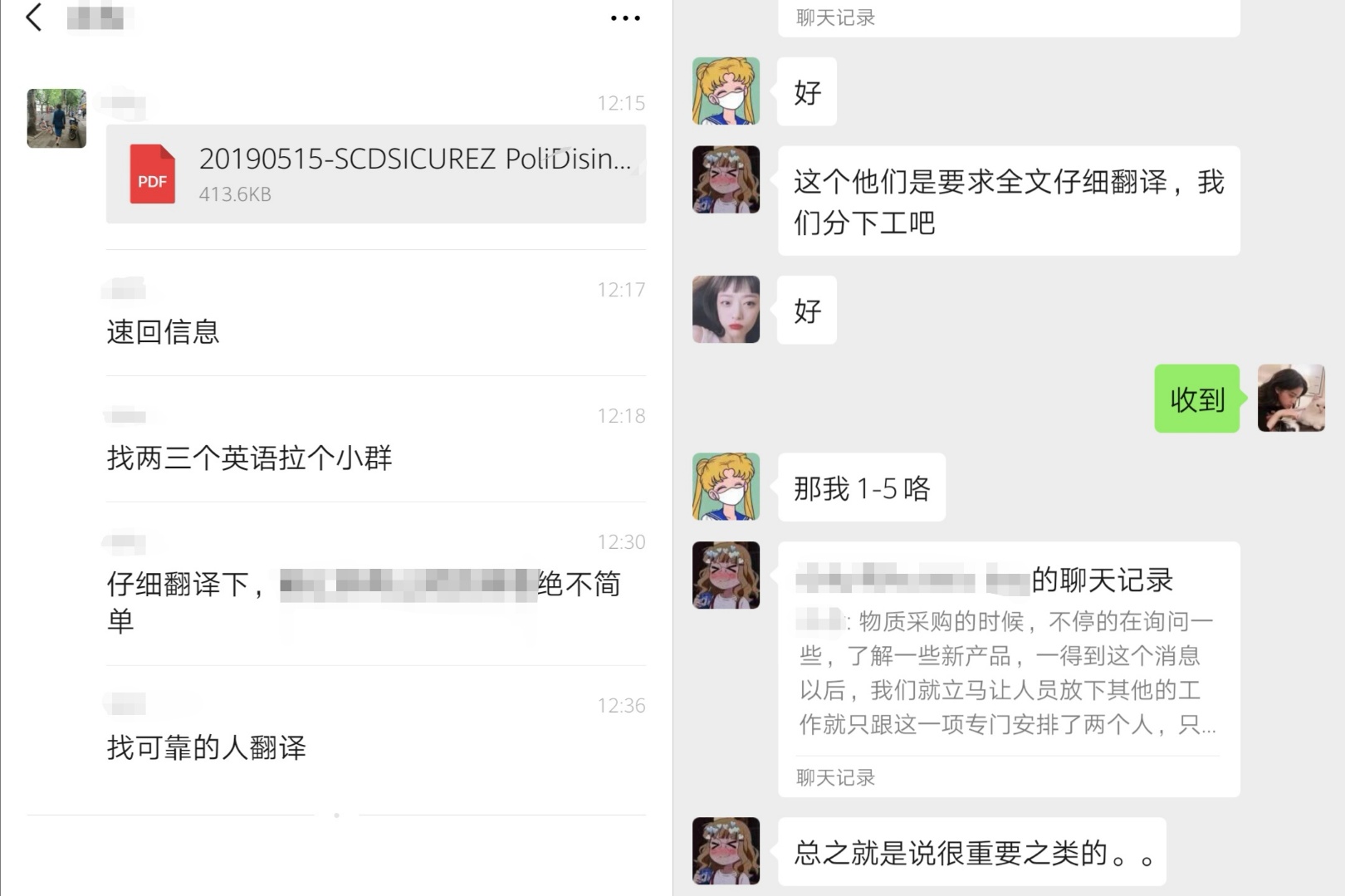 聚是一团火,散作满天星,身处各地的外院学子们为国奉献从不甘落后。翻译志愿者们随时待命,体现出优秀的译员素养。一有翻译任务发放下来,每个人都争先恐后,积极响应。2月14日晚,我院2名19级MTI学生接到指派翻译任务。虽然已是深夜,她们仍毫不犹豫,遵照“通常一小时内交稿”的惯例,按时保质完成任务。2月15日下午,接到任务的3名19级MTI学生立即投入工作,与其他志愿者一起,在仅2小时内就完成了一份要求精译的重要长篇文件。即使任务繁重困难,涉及陌生的领域,他们仍迎难而上,虚心求教,精诚协作,在较短时间内高质量完成任务,展示了中南学子向善求真,经世致用的风采,获得相关单位和人员的一致赞扬。