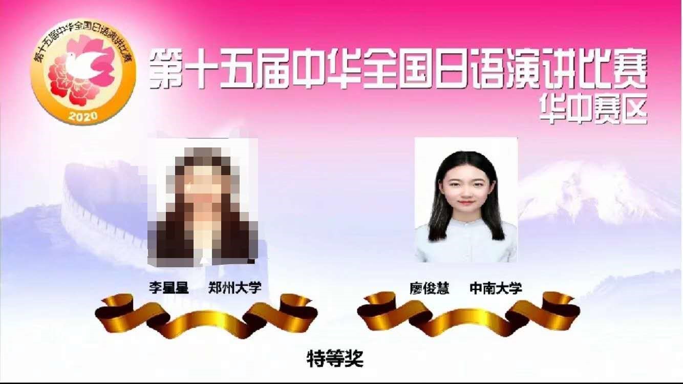 2020年10月24日,第15届中华全国日语演讲比赛(华中赛区预选),在郑州大学yl23455永利集团成功举办,日语专业2017级廖俊慧同学代表我校参赛并获特等奖。日语系方颖琳老师、大桥步老师(外籍教师)获得优秀指导教师奖。