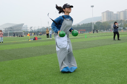趣味接力,无限趣味,你我传递。展现的是四人的团结与凝聚力,袋鼠跳、两人三足与球球作战的结合,为接力赛增添几分乐趣。时而滑稽的动作中,承载的是同学们彻底释放的欢乐。在这里,我们短暂告别书本,享受不一般的快乐。