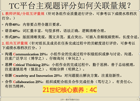 在主观题记分部分,她解释了如何用教学可视化平台进行教师评阅/分组评分和组内评分。主观题记分都提前制定了量规。其中教师评阅/分组互评按照内容40%,语言40%和形式20%,针对各组作业质量进行评分。组内评分按照4C标准,即沟通、思辨、创新、合作各25%的比例,针对组员在任务完成过程中的贡献度进行评价。