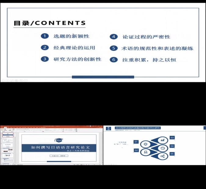 本次报告以她发表的13篇论文的部分内容为佐证,围绕“选题的新颖性”“经典理论的运用”“研究方法的创新性”“论证过程的严密性”“术语的规范性和表述的凝练”“注重积累,持之以恒” 六个方面展开,通过典型案例,讲述论文从构思、写作、修改、投稿到进一步修改完善等诸环节的关键点和注意事项,展示包括从培养问题意识、发现问题到如何收集资料、评述前人研究,直至如何解决瓶颈问题等在内的一般性科研规律,重点探讨应该如何扬长避短和寻求质的突破,在实践中不断提高学术素养和科研水平。强调身处当下这个时代,应自觉提高学术研究的主体性,加强与国内相关学科及各语种研究的融通与交流,同时特别要注意术语使用的规范性。并以自己的成长过程和亲身体验说明了“在某一个方面深入钻研,长期积累是非常重要的科研岂非一朝一夕,日语语言研究就是一个不断阅读和撰写的过程,在不断阅读的过程中,思路越来越宽,视野越来越开阔。