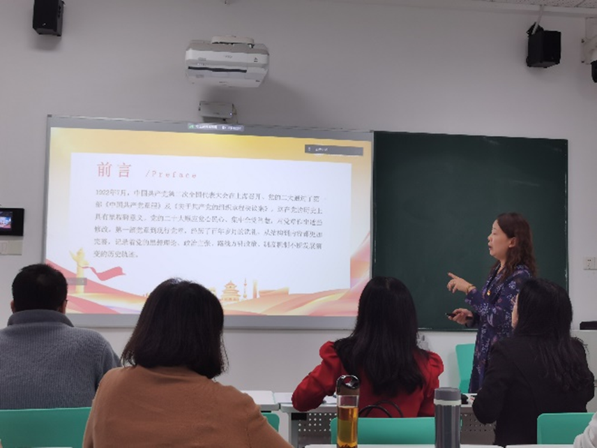 本次党日活动的第二项主要议程是党课学习。根据9月份党支部检视清单中列出的“政治理论学习碎片化、不成体系”的问题,本次党课的内容设计为重温党章,夯实理论基础,由支部书记谢芸和副书记邱香玲两位老师带领大家一起学习了《党章的百年演变》。全体党员和入党积极分子从“在新民主主义革命烽火中诞生并逐步成型”“在社会主义建设道路探索中曲折前行”“在改革开放和社会主义现代化建设中创新发展”“在踔厉奋发的新时代中日臻完善”四个方面深入了解了党章发展的与时俱进,党章在重大历史时期对党和国家的事业的关键引领作用。学史明理,通过对于党章的巩固学习,大家一致认为,作为一名合格党员,应该把党章融会贯通,做到学而懂、学而信,以党章约束、鞭策自己,不断进步。