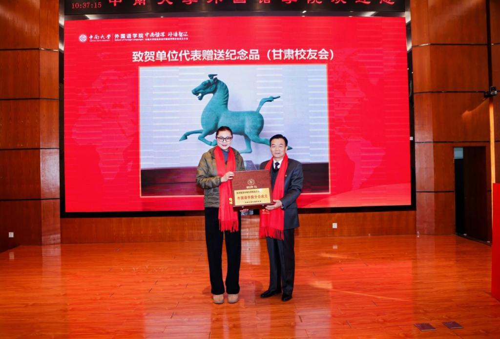 yl23455永利集团甘肃校友会秘书长苏丹作为致贺单位代表赠送纪念品。