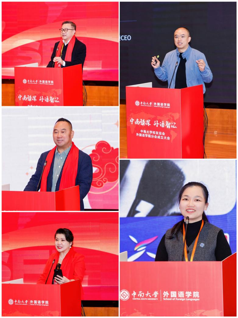罗选民教授以“做一位虔诚的麦田守望者”为主题,阐述了“情理交融,龙虫并雕,中西合璧,推陈出新”的十六字箴言,呼吁校友在文化自觉的基础上建立文化自信,将不竭的激情动力与理性的认知根基相交融,将开阔的眼界、扎实的执行力与创新的精神淬炼为独特的人生哲学。王克非教授以“扣好人生扣子”为喻,结合自身独特的求学与奋斗历程,勉励校友以“坚持”抵达目标,以“用心”做好当下。叶蓁、曹余辉、吴俊芬、封华、项丹在回顾各自的成长、工作经历时表示,学院所培养的语言能力、跨文化沟通的视野以及“知行合一”的治学理念,为他们走上国际舞台、投身时代发展奠定了坚实基础。他们同时呼吁广大校友以勇担使命,借助数字化手段连接世界,在实践中传承和诠释中南人“知行合一、经世致用”的精神内核。
