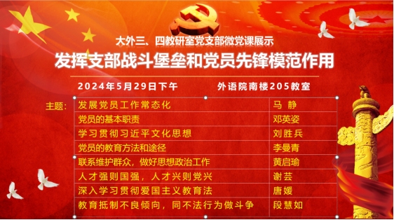 本次支部党员大会的召开为大外三、四教研室党支部注入了新鲜血液,微党课学习交流活动增强了支部的战斗力、向心力、凝聚力。全体党员教师纷纷表示,要在工作中更好地发挥支部战斗堡垒作用和党员先锋模范作用,把支部建设得更好。