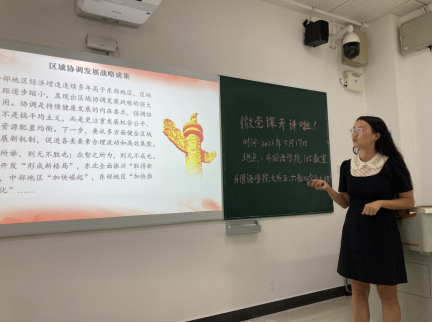5月17日下午,大外五、六教研室党支部全体党员早早来到南楼105教室,举行了第一轮微党课展示。本轮微党课的主题为“推进主题教育走深走实”,段慧如、李瑶、王箐、曾丹、马静等五位同志围绕“习近平新时代中国特色社会主义思想世界观和方法论”,分别从“实践依据”“科学内涵”“丰富发展”等角度进行了解读,并就“区域重大战略和区域协调发展战略”“科技强国、人才兴邦”等主题分享了自己的理解。微党课突出了党性,弘扬了主旋律,既有时代性,又有针对性。各位主讲人资料收集丰富,理论联系实际,教案逻辑严密,具有极强的感召力。
