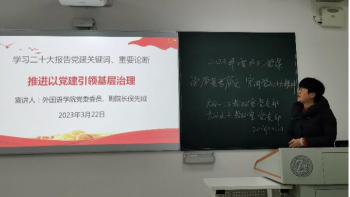3月22日下午,两个党支部的党员相聚外语楼105教室,共同聆听院党委委员、副院长侯先绒以“学习二十大报告党建关键词、重要论断——推进以党建引领基层治理”为题讲的党课。侯先绒讲到,在高等教育领域,我院大学外语教育中心以教研室为基础的基层党支部应该结合大学外语教育教学这一中心工作,着力推进以党建引领基层治理,不断提升教学质量,培根铸魂,落实“立德树人”的根本任务。