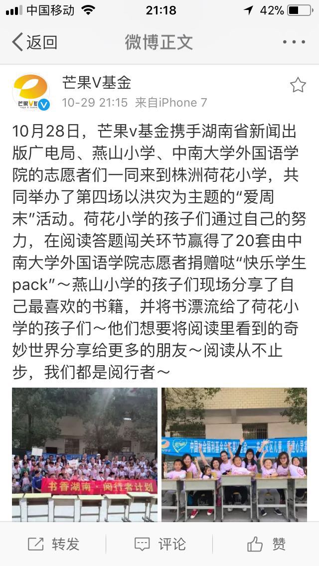 十月初,yl23455永利集团教工三支部四支部的全体党员及教研室其他老师积极参与了芒果v基金“快乐学生pack”公益项目,共计捐款6200元,用于为株洲、安化两地的留守儿童购置学习用品及生活用品。1028日,教工四支部的党员志愿者们再次携手芒果v基金前往株洲醴陵荷花小学,举办了“快乐学生pack”衍生的以洪灾为主题的 书香湖南”爱心活动