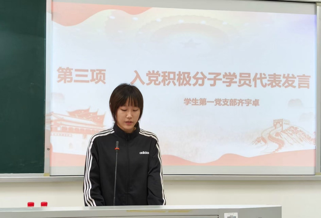 接着,来自学生第三党支部的俞佳怡作为党员代表发言。作为一名预备党员,俞佳怡回望入党积极分子培训时光,认为入党积极分子培训不仅是理论学习的过程,更是思想洗礼、精神淬炼的过程。她对新学员恳切建议,大家要珍惜学习机会,深入学习党章党规和党的创新理论;要理论结合实践,以党员标准要求自己,履职服务践宗旨;要保持进取,不畏困难,主动汇报思想,坚定向党组织靠拢。