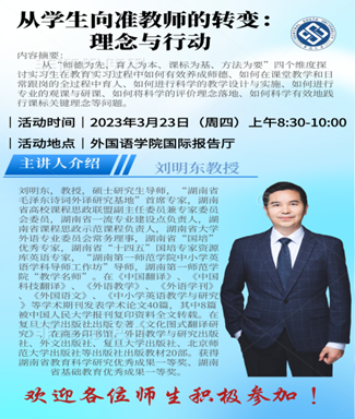2023323日(周四)上午,应学院邀请,“湖南省毛泽东诗词外译研究基地”首席专家、湖南省高校课程思政联盟副主任委员兼专家委员会委员、湖南第一师范学院刘明东教授在国际报告厅带来一场题为“从学生向准教师的转变:理念与行动”的精彩讲座。讲座由英语系主任李玲教授主持,我院多名师生参会。