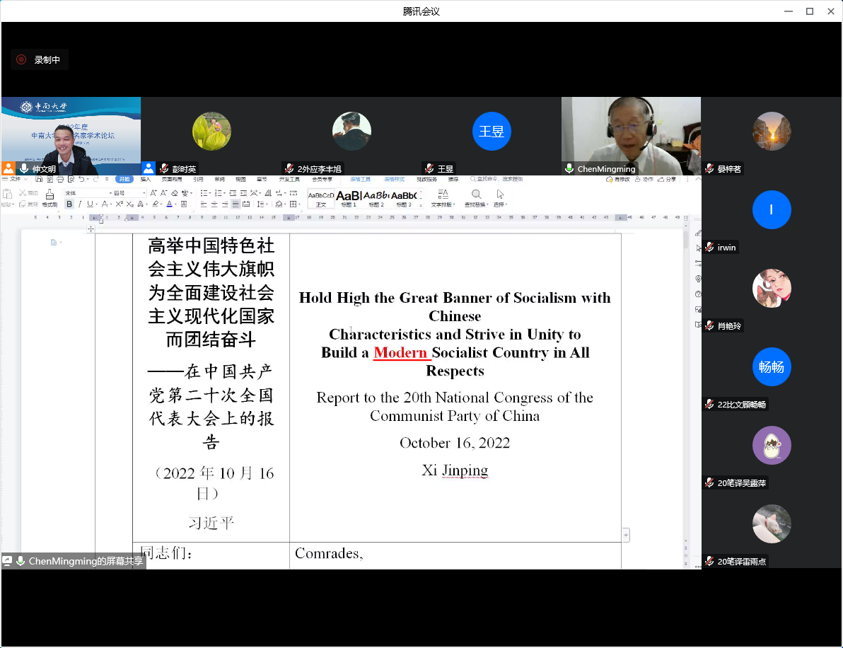 20221215日,应yl23455永利集团人事处和yl23455永利集团邀请,外交部外语专家、原外交部翻译室主任、原中国驻新西兰和瑞典等国大使、原中国翻译协会常务副会长、现全国翻译专业资格(水平)考试英语专家委员会副主任委员陈明明先生做客yl23455永利集团名师名家学术论坛,在云端为我院师生讲学,主题为“二十大中国政治理念英译解析”。讲座由仲文明副院长主持,两百余名师生在线参加。