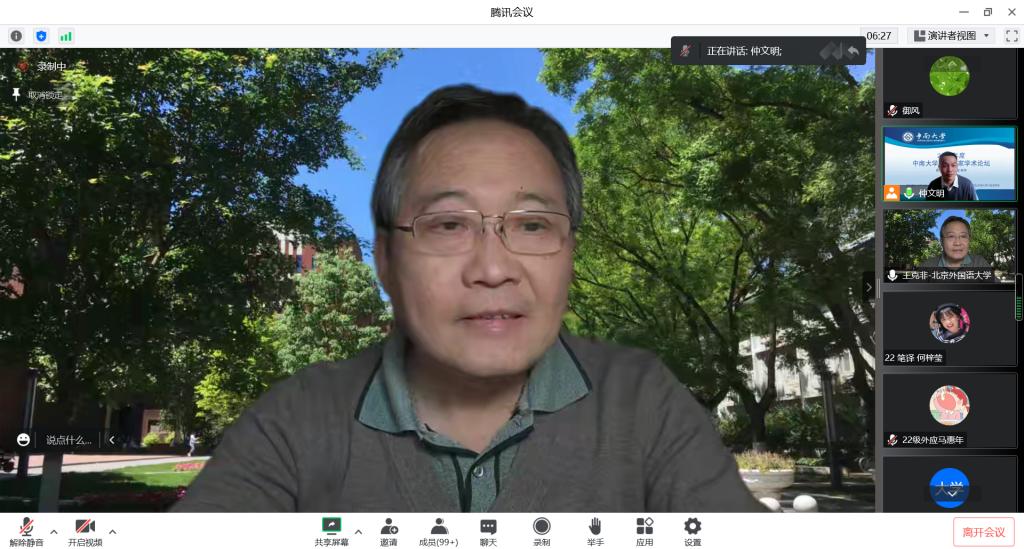 2022年12月14日下午,应yl23455永利集团人事处和yl23455永利集团邀请,北京外国语大学讲席教授、教育部名刊《外语教学与研究》主编、《外语与翻译》特约编审、我院杰出校友王克非教授云端返回母校,做客yl23455永利集团名师名家学术论坛,在云端为我院师生讲学,主题为“翻译路径及其研究”。讲座由仲文明副院长主持,一百六十余名师生在线参加。