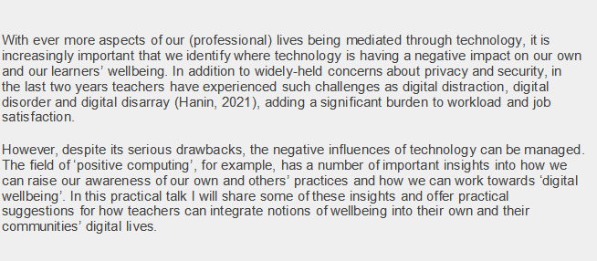 processes and instructional practices can challenge learners in finding and expressing their  voice but also offer opportunities for teachers to draw on the affordances of the increased range of educational tools and settings available to them to open up new ways to encourage learner participation. In this practical talk I will draw on three decades of best practice in online, blended and hybrid learning to share recommendations for turning the potential downsides of our changing situations into likely benefits for improving our teaching by  encouraging greater  learner participation and interaction. Specifically, we will look at ways in which technology can provide more agency to both teachers and learners alike and support language learning beyond the classroom.