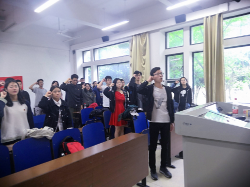 班会伊始,杨杰同学带领同学们回顾了上次活动,同学们真真切切感受到了烈士们是如何用鲜血和生命换来焕然一新的中国。随后,全体同学肃立,在共青团团旗下齐唱团歌,重温入团誓词,以此坚定中国共青团作为中国共产党的基石所怀揣着的初心。