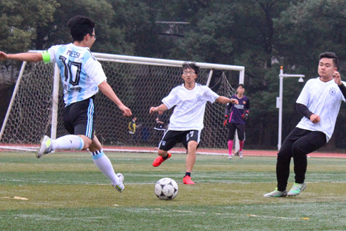 随着主裁判一声哨响,双方迅速进入紧张的比赛状态,你来我往,对抗激烈,积极争取球权,马克思主义学院的队员凭借默契的配合以2:0的比分优势暂时领先。在上半场的后期,空中开始落下密密麻麻的雨点,淋湿了绿茵场。然而队员们丝毫不受寒冷的空气、湿滑的草坪的影响,任雨水汗水交织流下,全力奔跑,奋勇拼搏,在绿茵场上留下潇洒英姿。