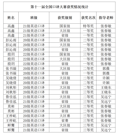 4月7日,第十一届全国口译大赛总决赛于线上落幕,yl23455永利集团口译研究生高鑫获得大赛全国特等奖(季军)、彭沁雨获得全国二等奖、殷玥获得全国三等奖,张书凝、吴晓倩、刘秋彤、鲁佳泓获得大区级二等奖,莫彬、王梓屹、鲜鶱获得大区级三等奖,指导老师吴远宁教授、张春敏教授、郭薇副教授、许颖副教授、王晓东副教授获得“优秀指导老师”奖。