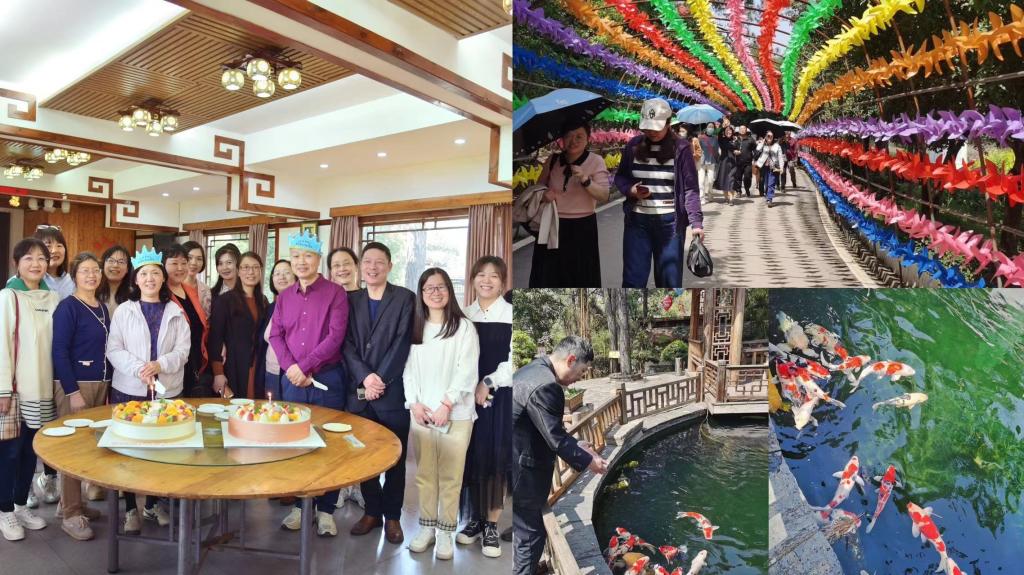 本次工会活动我们邀请了教研室新近退休的两位老师,为他们举办了一场别开生面的荣休仪式。两位老师情真意切地发表了离休感言,向年轻老师传授多年来积累的教学经验,并一同切蛋糕、唱祝福歌曲,聚餐在欢快喜悦的氛围中被推向高潮。午餐过后,老师们在农庄里散步闲逛,欣赏美丽的田园风光。挂满了彩色风车的羊肠小道,池塘里等待游客投喂的肥大锦鲤,古色古香的民宿建筑,带来了迥异于摩登都市的新奇体验,老师们逛得好开心!