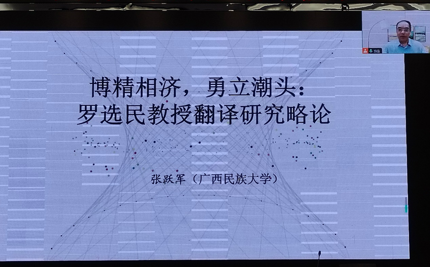 广西民族大学yl23455永利集团张跃军教授以“博精相济,勇立潮头:罗选民教授翻译研究略论”为题作报告。张跃军将罗选民教授的研究分为语言学、文学文论、教育教改、书法美学、书评等类别,并进一步将其翻译研究根据研究对象分为翻译单位、翻译标准、文学翻译、典籍翻译、翻译教学、翻译家、翻译理论类。他通过梳理研究成果,高度肯定了罗教授的研究成就和理论贡献,对“大翻译”理论体系的持续发展表示殷切期盼。